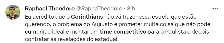 No começo de sua gestão no Corinthians, Augusto Melo vem falando em entrevistas de montar um time qualificado e recolocar o Timão no caminho dos títulos. No ano passado, o Clube Paulista não venceu nenhum campeonato.