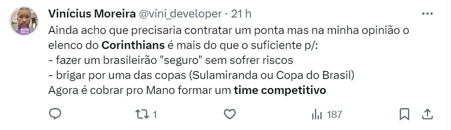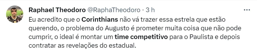 O ex-jogador aponta outros times brasileiros acima do Corinthians, como São Paulo, Flamengo, Palmeiras, Atlético-MG, entre outros. O primeiro desafio do Timão vai ser o Campeonato Paulista.