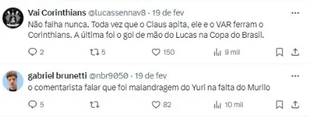 Por outro lado, Ricardinho, comentarista, e Jadson, ex-jogador do Corinthians, falaram que expulsariam Murilo no lance pela gravidade da entrada do zagueiro do Palmeiras, discordando da dupla acima: