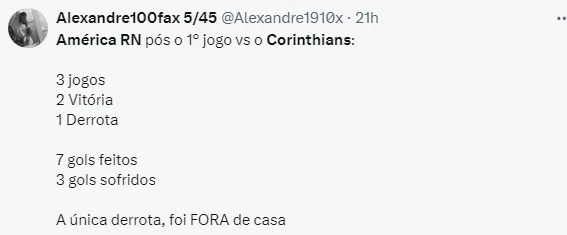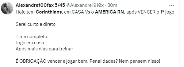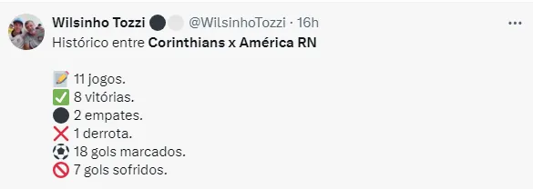 O Corinthians enfrenta em casa o América do Rio Grande do Norte pelo jogo de volta da terceira fase da Copa do Brasil. O timão venceu por 2 a 1 na ida e precisa somente de um empate para se classificar para as oitavas de final.