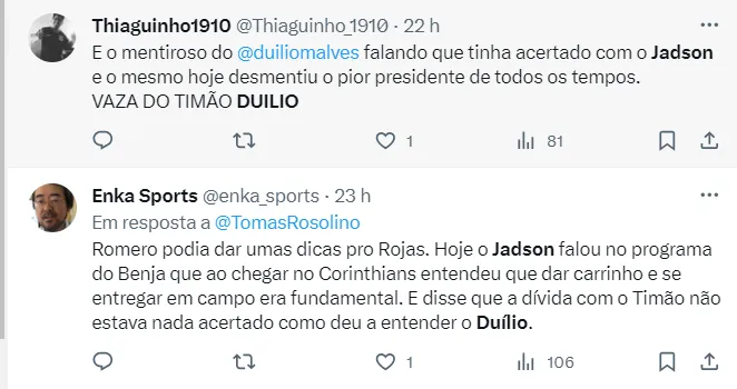 O presidente do Corinthians, Duílio Monteiro Alves, e Jadson, ex-jogador do Corinthians, têm dado declarações diferentes sobre um assunto na última semana. Tudo começou com uma resposta do presida do Corinthians.