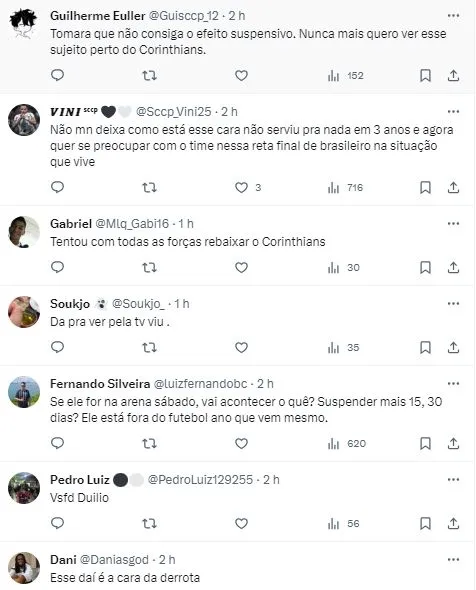Aliás, a gestão de Duílio Monteiro Alves se prepara para passar o bastão a Augusto Melo, que vai assumir a presidência em janeiro de 2024. Entretanto, os últimos momentos de Duílio no Parque São Jorge estão comprometidos.