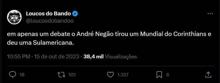 Neto ainda destacou a apresentação de André Negão, onde reconheceu os serviços que foram prestados ao Clube pelo candidato. Mas, entregou que ele ajudou na construção do Centro de Treinamento e do estádio, mas recordou que a dívida atual chega em torno de R$ 1 bilhão. Neto ainda criticou o despreparado do candidato, que desconhecia a história do Clube. “Como é que um candidato como o André Negão vai despreparado, não consegue falar? Imagina ele sentado com as empresas (de comunicação) pra vender uma propaganda. Como o Corinthians vai estar preparado com isso?”, indagou. “Não sabe que o Corinthians foi campeão (Mundial) em 2000. Eu fiz (a transmissão). Foi uma das maiores audiências”, relembrou.