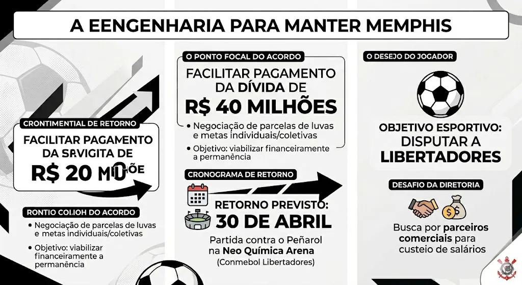 Nos bastidores, a diretoria do Sport Club Corinthians Paulista tenta resolver uma equação incômoda. De um lado, há cerca de R$ 40 milhões a serem pagos a Memphis Depay. De outro, a necessidade de encontrar no mercado quem banque a continuidade de um salário que, para os padrões do clube, pesa. Traduzindo: o Timão corre atrás de dinheiro para quitar o passado e, ao mesmo tempo, viabilizar o futuro.