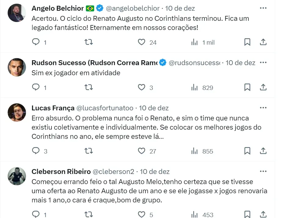 “Renato Augusto era o jogador com técnica mais apurada no Corinthians, mas era hora de trocar. Ele teve muito desgaste físico, jogou um número muito pequeno de partidas e fica difícil renovar nessas condições”, disse Flávio Prado.