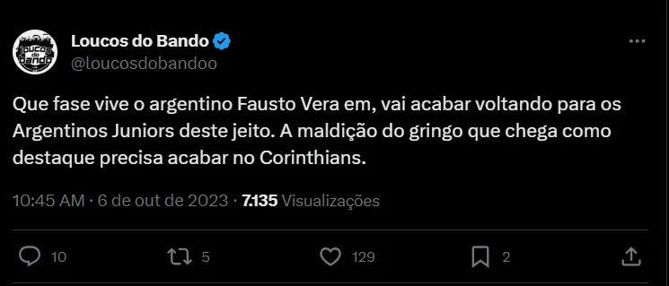 O portal ainda revelou que pessoas próximas ao jogador afirmaram que não existe qualquer quadro de ansiedade ou problema emocional. Fausto Vera entende que a sua saída da equipe aconteceu de forma exclusiva pelas decisões dos treinadores, em especial Vanderlei Luxemburgo. Agora o Corinthians se prepara para o confronto diante do Flamengo, marcado para o próximo sábado (7), às 21h, na Neo Química Arena, pelo Campeonato Brasileiro.