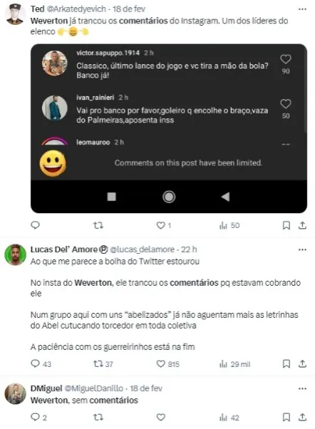 Nessa linha, segundo as informações publicadas no site Uol Esporte, Weverton, que teve influência no resultado, tomou uma primeira decisão, escolhendo se blindar de ainda mais críticas, desta vez extracampo.