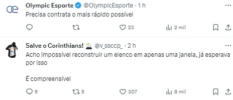 Até aqui, alguns atletas já foram ventilados como possíveis reforços no Timão. Os principais nomes citados até agora foram: o atacante Luiz Henrique, do Real Betis, da Espanha, Róger Guedes, do Al-Rayyan, do Catar, e Vincent Aboubakar, do Besiktas, da Turquia.