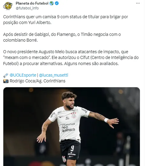 De acordo com informações apuradas pelo portal Globo Esporte, Augusto Melo ainda quer a contratação de três atacantes nesta janela de transferências. Ele entende que precisa reforçar o setor para elevar o nível do elenco.