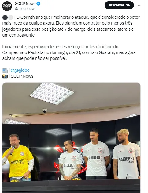 A diretoria do Alvinegro do Parque São Jorge já deixou claro que está focado em fechar com os dois pontas e um centroavante até o fim da janela de transferências. A equipe tem até o dia 7 de março para fechar o elenco.