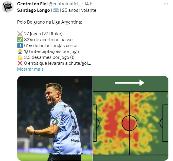 “Cruzeiro pode voltar a carga por Santiago Longo, meio-campista do Belgrano. Já acompanham há algum tempo, mas até o momento não há nenhuma proposta formal. Corinthians também está atento à situação do jogador de futebol”, informou.