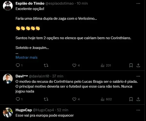 Nos últimos dias, ganhou força uma possível troca do Corinthians com o Santos. Na negociação, o Timão cederia o goleiro Ivan em troca do atacante Lucas Braga, mas Augusto Melo já mandou uma resposta para Marcelo Teixeira.