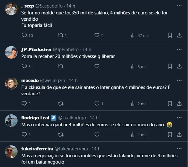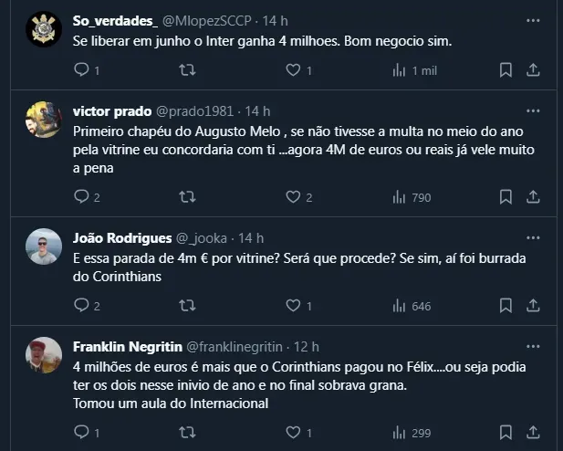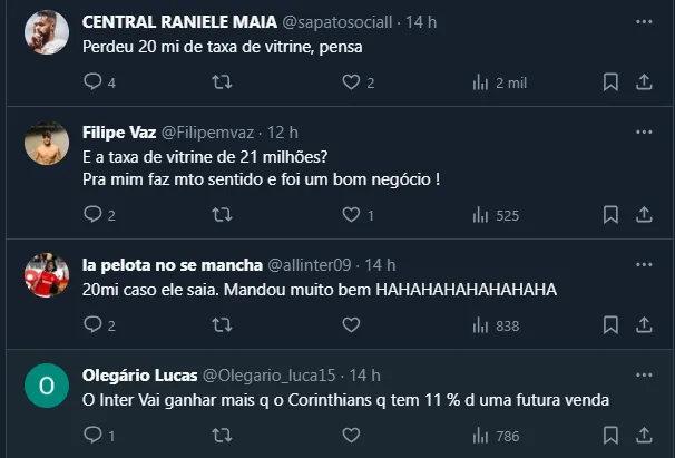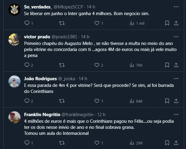 Não à toa, o assunto repercutiu muito nas redes sociais, principalmente após o anúncio oficial de Robert Renan no Internacional e da novela envolvendo Félix Torres, que ainda não chegou oficialmente ao Timão.