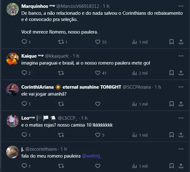 De qualquer forma, como vive uma relação de rompimento com o ex-jogador do Racing (ARG), o assunto acabou virando tema entre os corintianos na web e a presença de Romero foi ainda mais exaltada.
