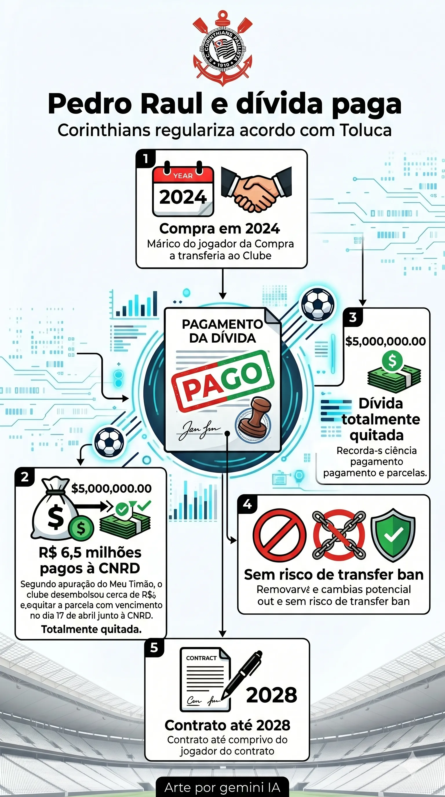 O Corinthians informou neste sábado (18) que pagou duas parcelas atrasadas referentes à compra do atacante Pedro Raul junto ao Deportivo Toluca, do México. A pendência financeira vinha sendo tratada como uma das prioridades da diretoria para evitar novos problemas administrativos e possíveis punições da Fifa, como um eventual transfer ban.