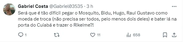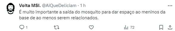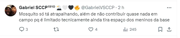 “Posso assegurar para vocês que não existem tratativas entre o Cruz-Maltino e o Corinthians pelo jogador. Mas com a chegada de Pedro Henrique, Mosquito vai ter ainda menos espaço. A tendência é ser negociado caso pinte proposta interessante”, explicou o comunicador em seu canal no Youtube.