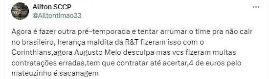 Até o momento, o Corinthians trouxe 11 reforços para 2024, sem contar o treinador português António Oliveira. O presidente Augusto Melo prometeu uma verdadeira reformulação radical no elenco e, goste ou não do rendimento da equipe, é isso que vem acontecendo.