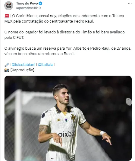 Ainda vale destacar que o setor de Pedro Raul é carente no Corinthians, pois Yuri Alberto, no momento, é a única opção. Agora, resta aguardar o desfecho do negócio que está se encaminhando.