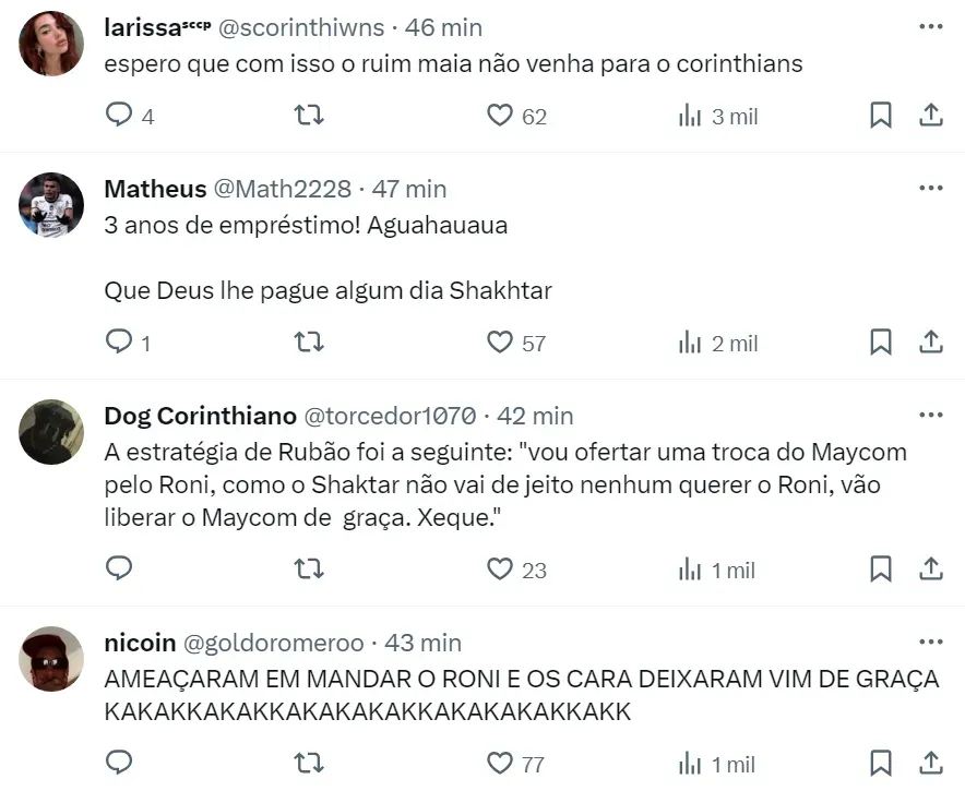 Mas o Alvinegro do Parque São Jorge não para por aí e fechou neste sábado (30) a permanência do volante Maycon, que pertence ao Shaktar Donetsk, da Ucrânia. O jogador foi novamente emprestado ao Timão.