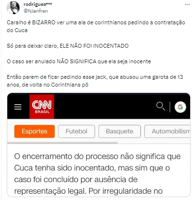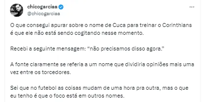 “O que consegui apurar sobre o nome de Cuca para treinar o Corinthians é que ele não está sendo cogitado nesse momento”, iniciou o jornalista em uma postagem nas suas redes sociais.