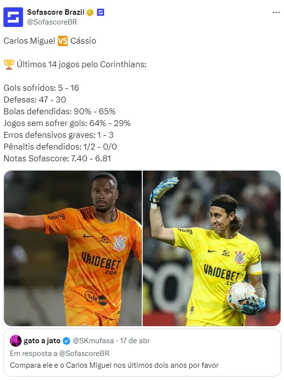 Enquanto isso, Carlos Miguel é novo e não tem a mesma experiência que o ídolo do Corinthians. Porém, tem atuações sólidas, sua impulsão e elasticidade chamam atenção, além de chegar sem a grande pressão da torcida.