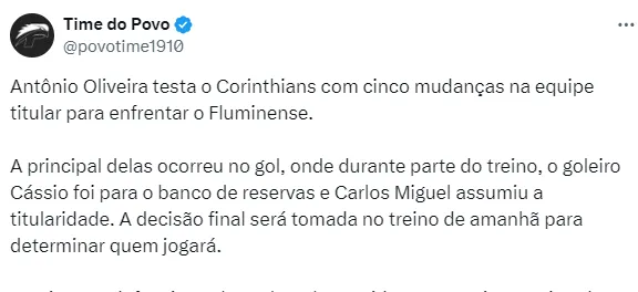 Apesar de decidir renovar com Cássio, a diretoria do Corinthians vê com bons olhos um descanso para o goleiro. A tendência é de que Carlos Miguel ganhe espaço.