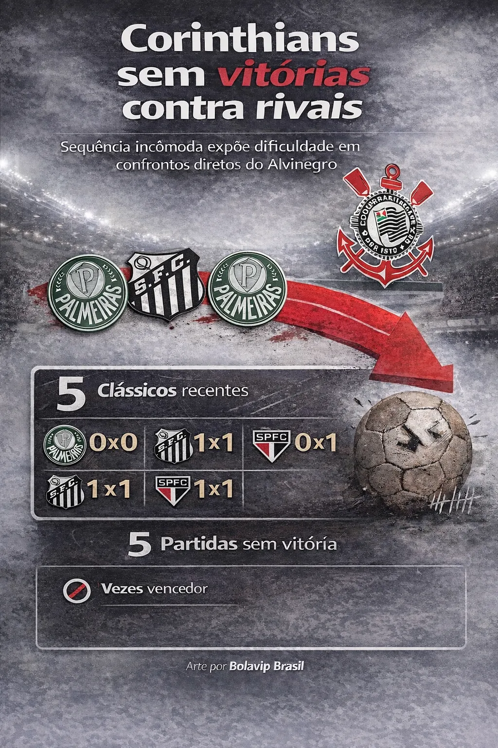 Desde então, o Corinthians soma cinco partidas sem triunfar contra rivais estaduais. Nesse período, foram três empates em 1 a 1 diante de Santos e São Paulo, além de uma derrota para o Palmeiras, dentro da Neo Química Arena, ainda pelo Campeonato Paulista deste ano.