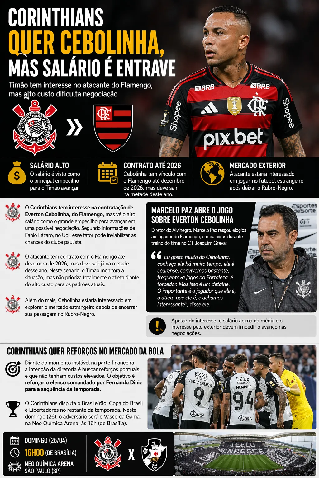 O Corinthians tem interesse na contratação de Everton Cebolinha, do Flamengo, mas vê o alto salário como o grande empecilho para avançar em uma possível negociação. Segundo informações de Fábio Lázaro, no Uol, esse fator pode inviabilizar as chances do clube paulista.