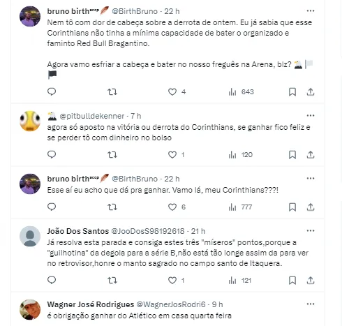 Se vencer o Atlético-MG em casa, o Timão vai para 43 pontos, e pode sair da décima terceira colocação, conseguindo um “respiro”, porém, isso vai depender de outros jogos, como do Cuiabá e São Paulo, que estão na frente na tabela de classificação.
