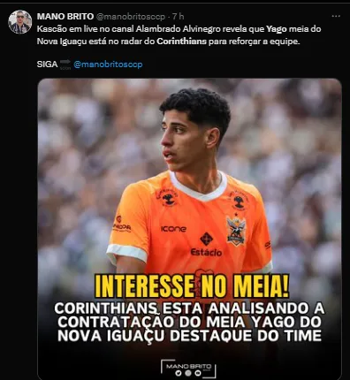 Kascão, que trabalha com o ídolo do Corinthians no programa Os Donos da Bola, revelou em live que o nome que o Alvinegro quer contratar é o jovem meia de 22 anos Yago, do Nova Iguaçu, um dos destaques neste começo de temporada.