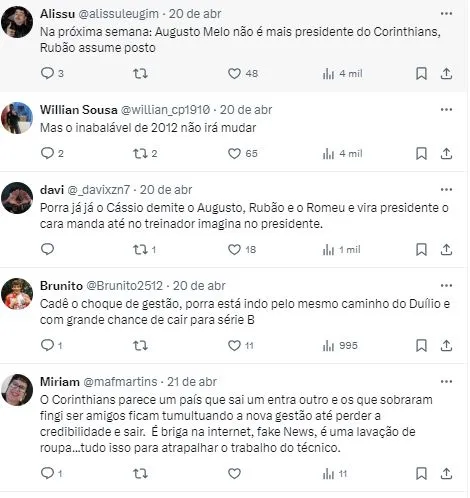 Isso porque o clima entre Augusto Melo e o diretor de futebol estatutário, Rubens Gomes, o Rubão, complicou e o presidente deve anunciar qual decisão tomará sobre seu dirigente até o final da atual semana, segundo apuração do portal Meu Timão.