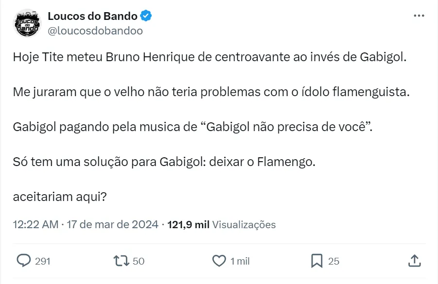 “Momento de Gabigol é ruim, especialmente pela péssima relação com Tite. O atleta só tem oito jogos na temporada, com dois gols e nenhuma assistência. Está claro para todo mundo que ele não faz parte dos planos de Tite e do Flamengo”, disse Jorge Nicola.