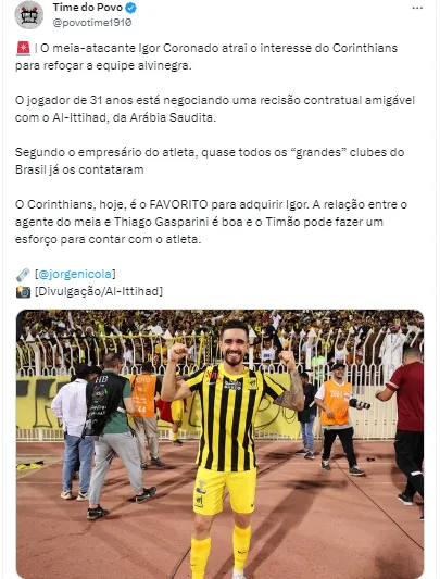 Igor Coronado foi um dos nomes que agitou o mercado de transferências do futebol brasileiro. Ele está no Al-Ittihad, da Arábia Saudita, e seu futuro está em aberto. O comandante do time árabe é o badalado treinador Marcelo Gallardo, além de contar com nomes como Kanté, Benzema, Fabinho e Romarinho.