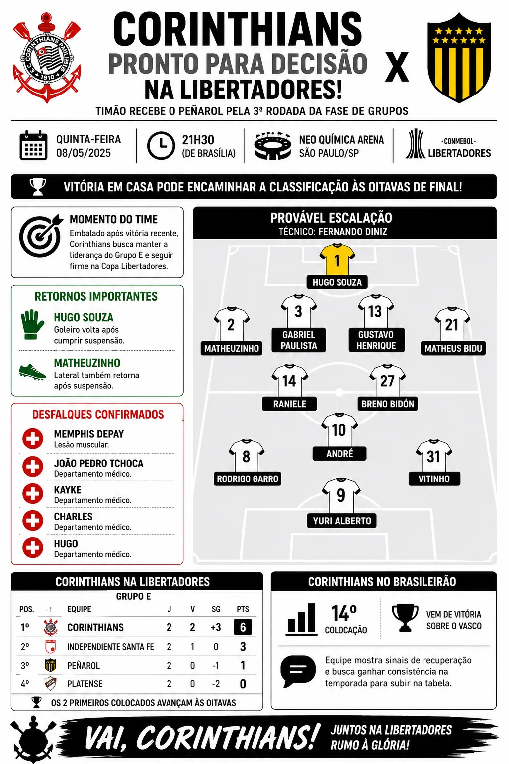 Na Libertadores, o Timão lidera o Grupo E com seis pontos. A equipe venceu Platense e Santa Fe nas duas primeiras rodadas. Já no Brasileirão, o cenário é de recuperação. O Corinthians ocupa a 14ª colocação, mas vem de vitória sobre o Vasco e tenta ganhar consistência na temporada.