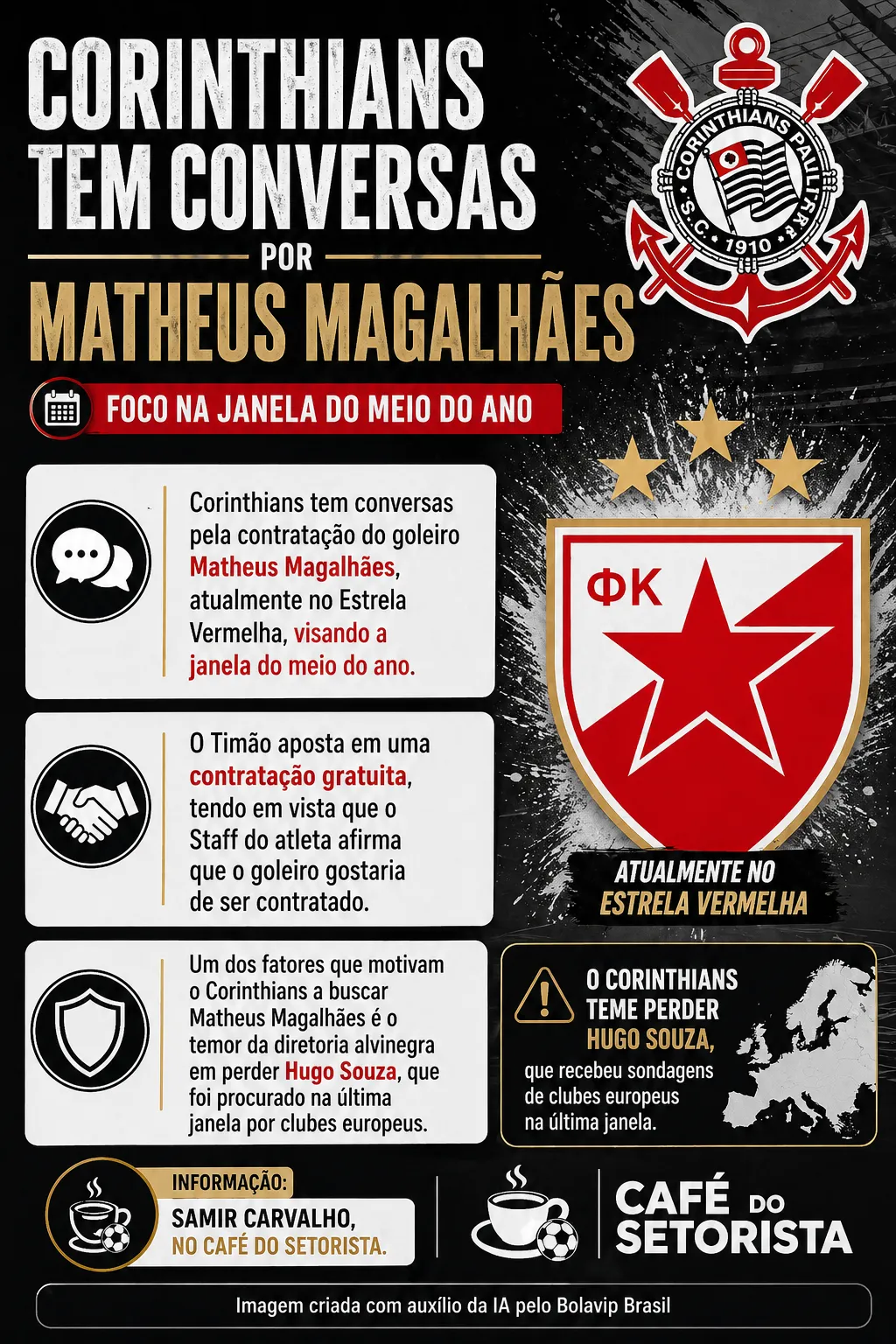 Um dos fatores que motivam o Corinthians a buscar Matheus Magalhães é o temor da diretoria alvinegra em perder Hugo Souza, que foi procurado na última janela por clubes europeus”, publicou o portal Time do Povo, dando os devidos créditos.