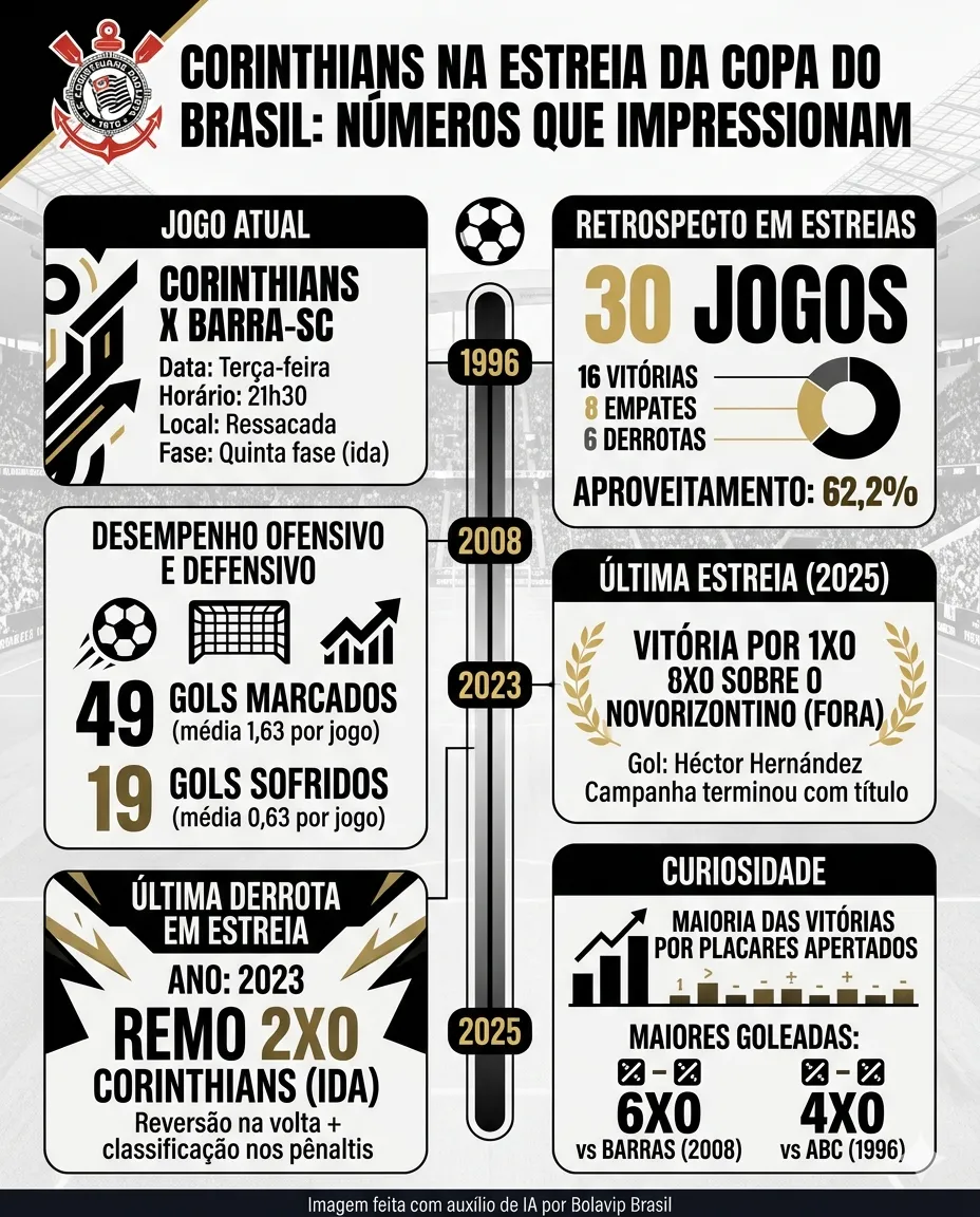 Ao longo da história da competição, o clube paulista costuma largar bem no mata-mata nacional. De acordo com o ‘Meu Timão’, em 30 estreias já disputadas, o time soma 16 vitórias, oito empates e apenas seis derrotas.