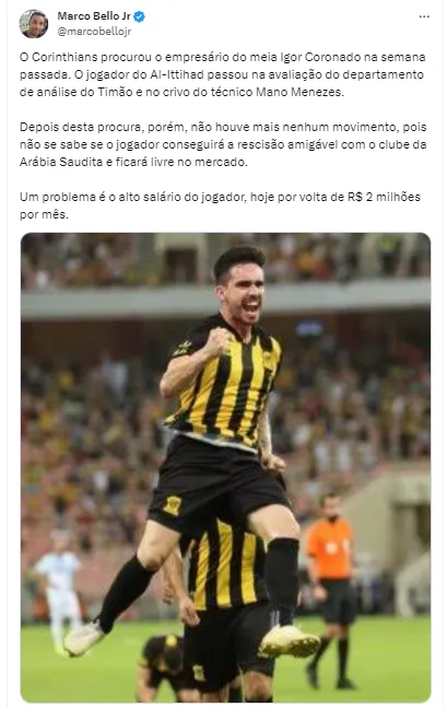 O Corinthians procurou o empresário do meia Igor Coronado na semana passada. O jogador do Al-Ittihad passou na avaliação do departamento de análise do Timão e no crivo do técnico Mano Menezes”, iniciou Marco Bello.