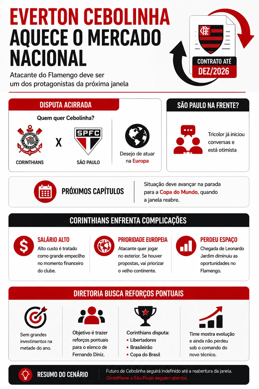 Everton Cebolinha aquece o mercado nacional e deve ser um dos protagonistas da próxima janela de transferências. O atacante está em reta final de contrato com o Flamengo e atrai o interesse do Corinthians, que busca reforços para a sequência da temporada.