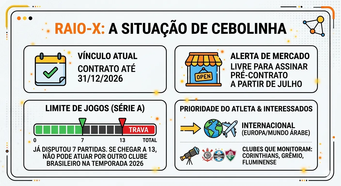 Em contato com os jornalista no Joaquim Grava, Marcelo Paz destacou que Cebola está disponível no mercado para assinar pré-contrato, mas indica que o atacante tem preferência pelo exterior.