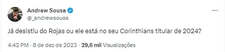 De acordo com informações publicadas pelo GE, mesmo com a desconfiança de Augusto Melo pelos altos valores que envolveram a chegada do meia, Mano Menezes decidiu que vai dar chances para Rojas em 2024 e vai apostar na recuperação dele no Timão para a próxima temporada.