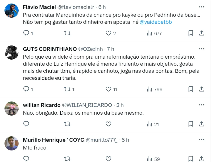 Além disso, a Rádio Itatiaia informou que o Clube Paulista tem interesse na contratação do atacante Marquinhos, do Arsenal, interessa ao Timão. Mas o jogador já definiu o seu futuro e não vai jogar no Alvinegro. A informação é do jornalista Felipe Cardoso.