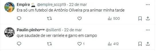 Enquanto isso, o Timão segue se preparando para a Copa Sul-Americana, para a terceira fase da Copa do Brasil e para o Campeonato Brasileiro. Sem atuar, marcou um amistoso contra o Santos que foi cancelado.