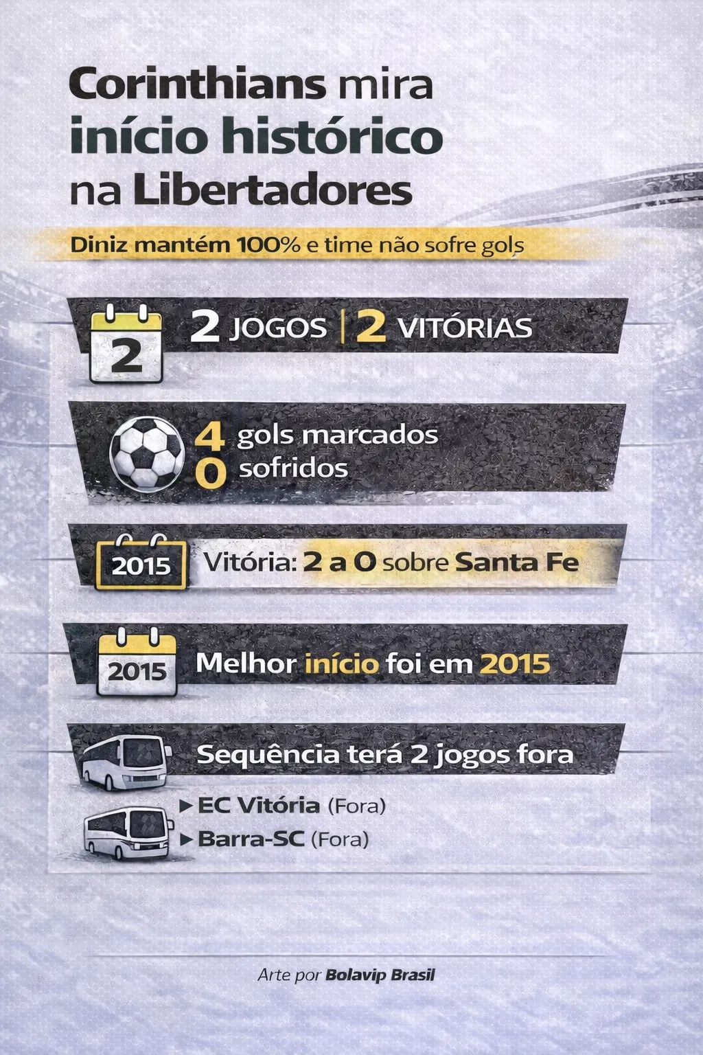 Além do mais, somou seis pontos nos primeiros dois jogos da Copa Libertadores, marcando quatro tentos e não sofrendo nenhum. Isto é, o Coringão já detém, no mínimo, seu 3° melhor início no principal torneio do continente.