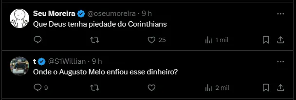 O Corinthians vive um momento financeiro delicado, com dívidas que ultrapassam a casa do bilhão, conforme publicado em diversos meios de comunicação. Todavia, Augusto Melo está em busca de patrocínios que possam ajudar a resolver essas questões pendentes.