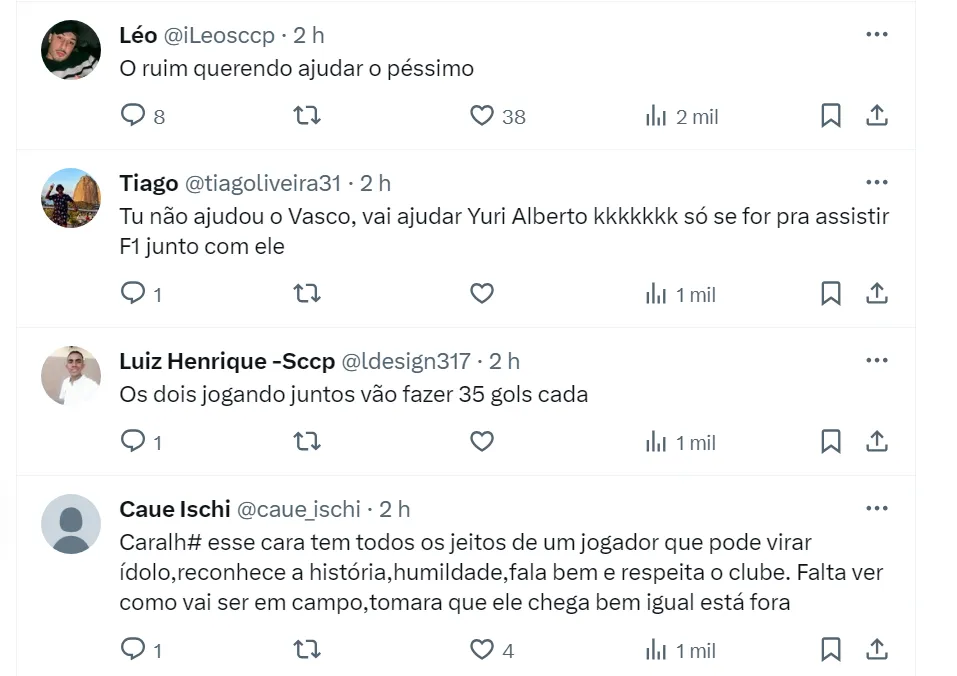 Dessa forma, Yuri Alberto por enquanto segue no time corinthiano. O atacante de 22 anos tem contrato com o Alvinegro do Parque São Jorge até o final de 2027 e não vive um bom momento.