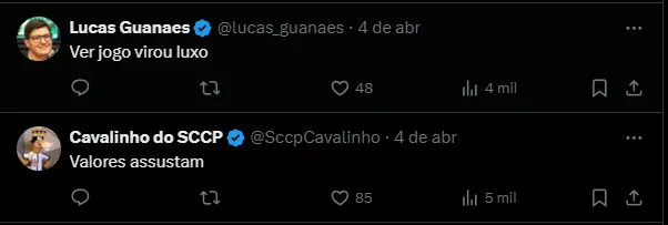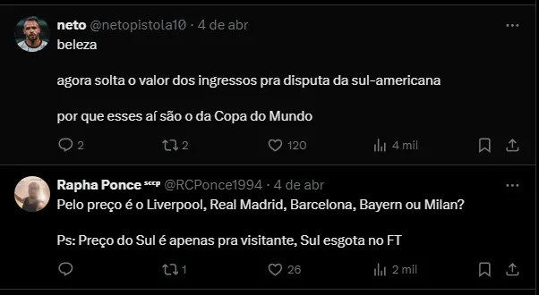 Na quinta-feira (4), o clube anunciou, em suas redes sociais, os valores dos ingressos para o confronto da competição nacional. Todavia, a torcida não gostou do que viu e reclamou.