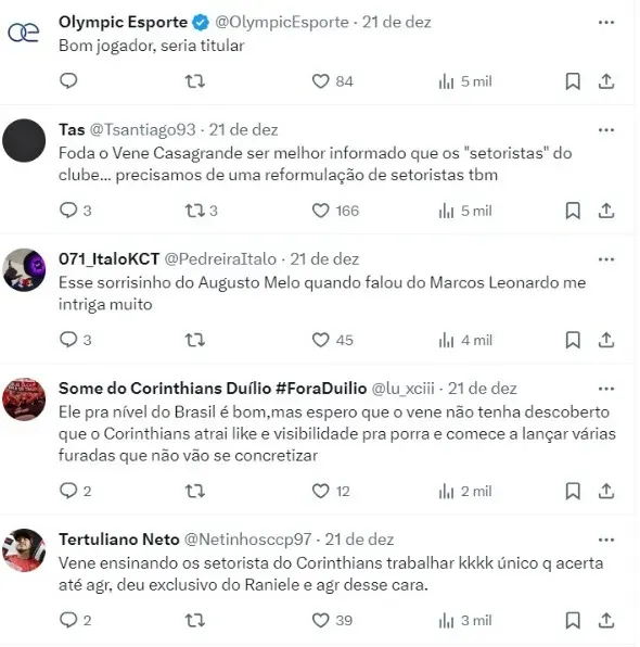 “Mais um nome que o Corinthians quer contratar: Iago, lateral esquerdo do Augsburg, da Alemanha, desde 2019. O contrato com o time alemão vai até junho de 2024. O jogador tem 26 anos e é cria do Internacional”, escreveu ele em sua conta no X (antigo Twitter).
