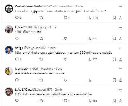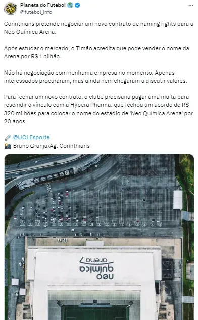 Com isso, de acordo com informações apuradas pelo jornalista Samir Carvalho, que cobre o Corinthians, a equipe fez um estudo e quer o valor de R$ 1 bilhão pelos naming rights da Neo Química Arena.