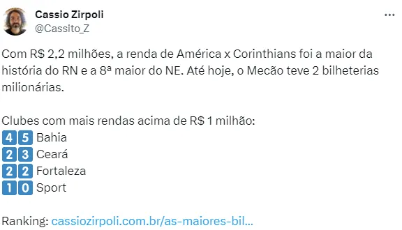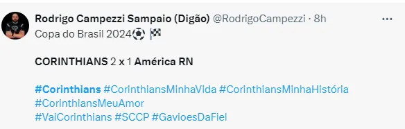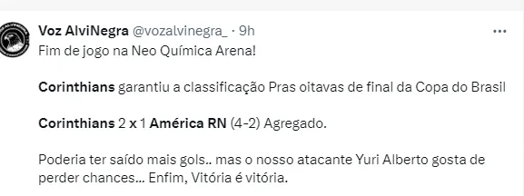 Corinthians jogou na noite de quarta-feira(22) a partida de volta da 3ª fase da Copa do Brasil contra o América do RN. Na ida tinha sido 2 a 1 para o Timão e o placar voltou a se repetir na Néo Química Arena, com isso o clube paulista está classificado para as oitavas deste torneio nacional