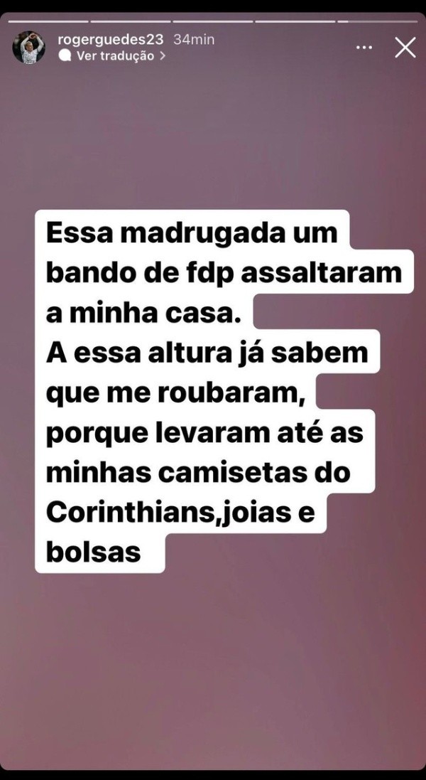 “Essa madrugada um bando de fdp assaltaram (sic) a minha casa. A essa altura já sabem que me roubaram, porque levaram até as minhas camisetas do Corinthians, joias e bolsas”, desbafou Guedes em seu perfil no Instagram.